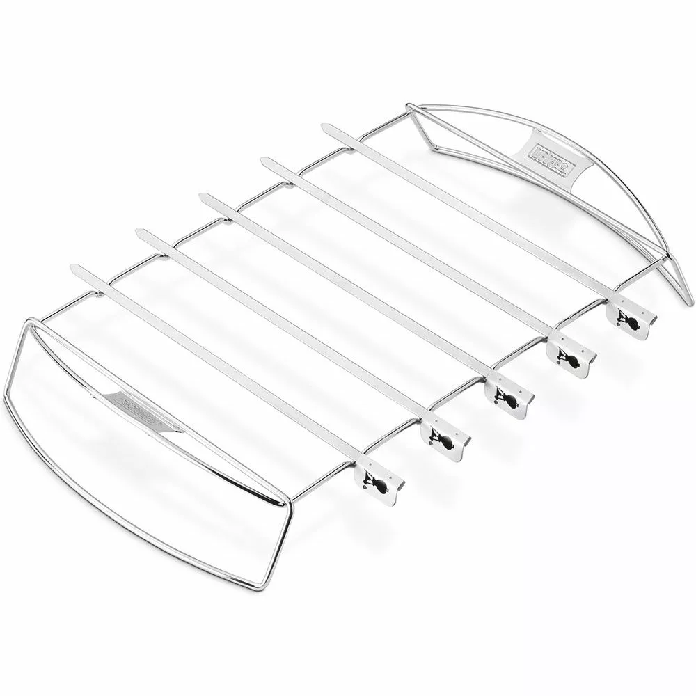 Praktiskt kebabset från Weber med fem grillspett och stativ, som lyfter upp kött och grönt en bra bit över grillgallret så att du enkelt kan rotera spetten under grillningen